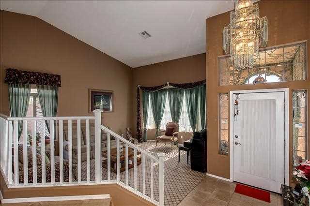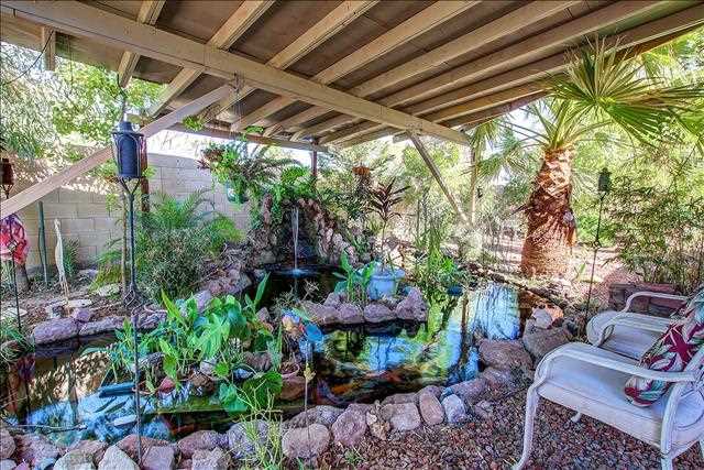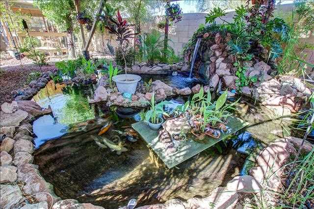 Grand entry into lovely living room and porcelain tile staircase. Gourmet kitchen with corian counters, island, dining and walk-in pantry & tile-wood flooring. Formal dining room. Large family room with fireplace that opens to patio and back yard. Den/office with built-in custom bookcases. Upstairs you find a large master bedroom with walk-out lanai and a beautiful master bath with separate tub & shower & walk-in closet. 2 more bedrooms & a clothes-chute to the downstairs laundry room. Plenty of room in the 3 car garage with work area. A truly remarkable back yard that features a huge covered waterfall & pond area that comes with an entire family of Japanese Koi! Gazebo & wired for hot tub. Save big time with 5.7 KW solar energy system that is completely pain off.