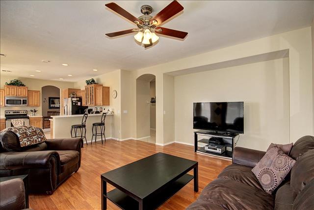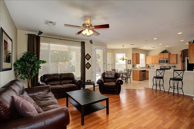 Beautiful 4 and 3 bath home with den that works perfectly as office or extra bedroom. Open floor plan with tile and laminated flooring. Covered patio and outdoor fireplace. Backyard is perfect for children and entertaining. This home is well taken care. Very neat and clean. Minutes from schools, parks, golf and recreation center. A must see! Move in ready.